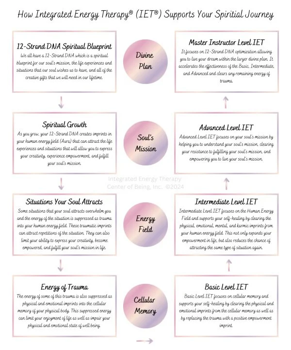 Integrated Energy Therapy® (IET®) is a gentle, heart-centered energy modality designed to help release suppressed emotional patterns stored in the body. It supports the natural flow of life force energy so you can move forward with greater clarity, balance, and empowerment.